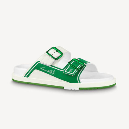 These Louiss Vuitton Trainer Slides in white and green are perfect for athletes and fashion enthusiasts alike. Made with quality materials, these slides provide comfort and style. Their unique design and signature branding make them a must-have for any wardrobe. Elevate your look with these trendy and functional slides.