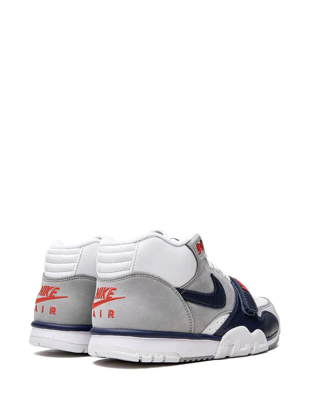 Combining features of a casual and a sports shoe, the Air Trainer 1 sneakers have become one of Nike’s most iconic silhouettes. Seen here in a grey, dark blue, white and orange colourway, the pair is finished with a signature Swoosh logo to the sides.